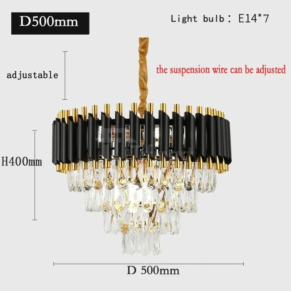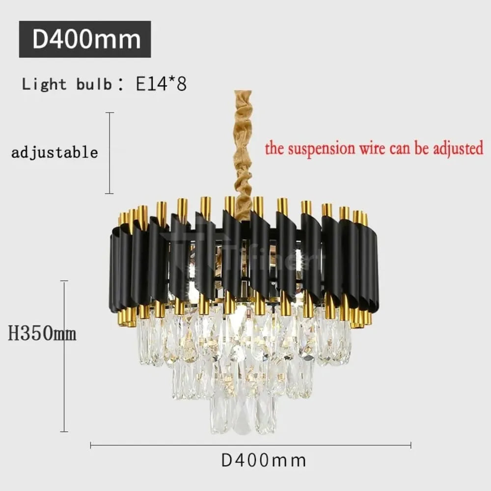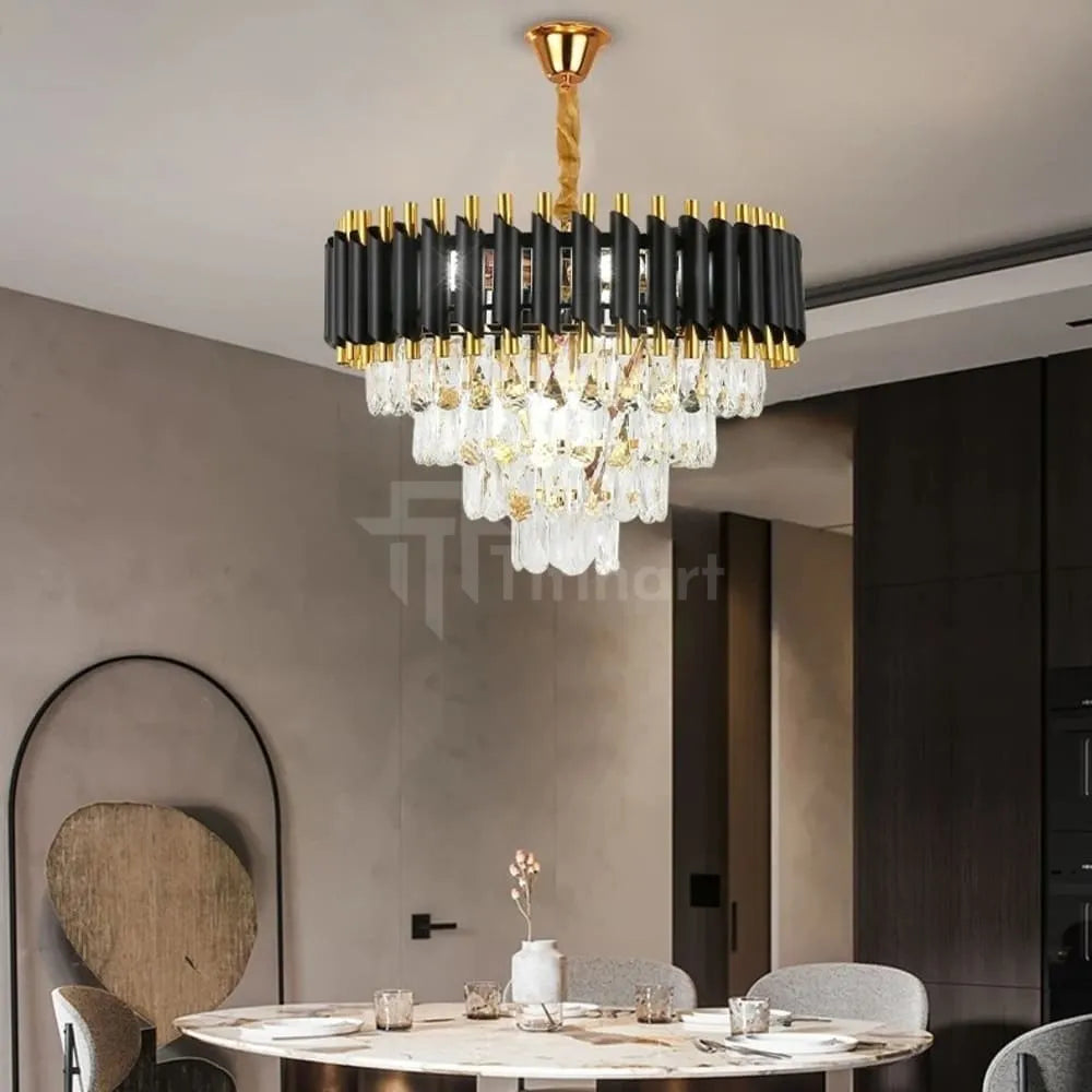 Le lustre PRESTIGE incarne le raffinement absolu. Sa structure noire élégante et ses pampilles en cristal jouent avec la lumière pour créer un contraste saisissant et sophistiqué.