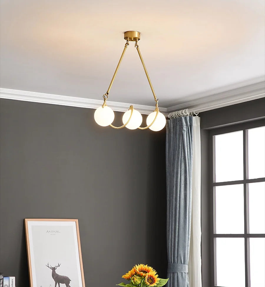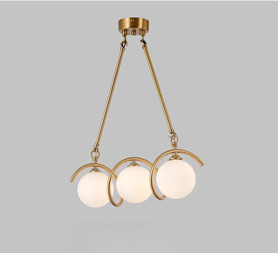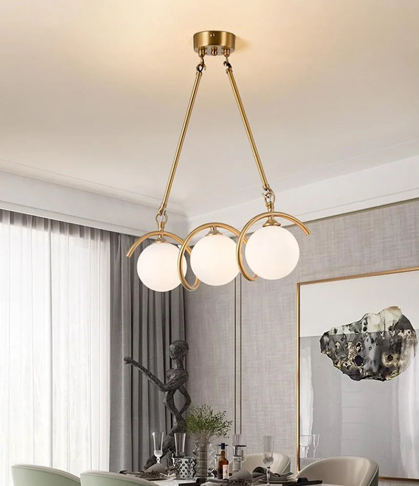 Ajoutez une touche d'élégance à votre intérieur avec la Suspension COCO. Ce luminaire moderne est composé de trois boules en verre opale, délicatement entourées d'un cadre en métal doré, créant un contraste subtil et raffiné. Idéale pour éclairer un salon, une salle à manger ou une chambre, cette suspension diffuse une lumière douce et chaleureuse, parfaite pour apporter une atmosphère accueillante.