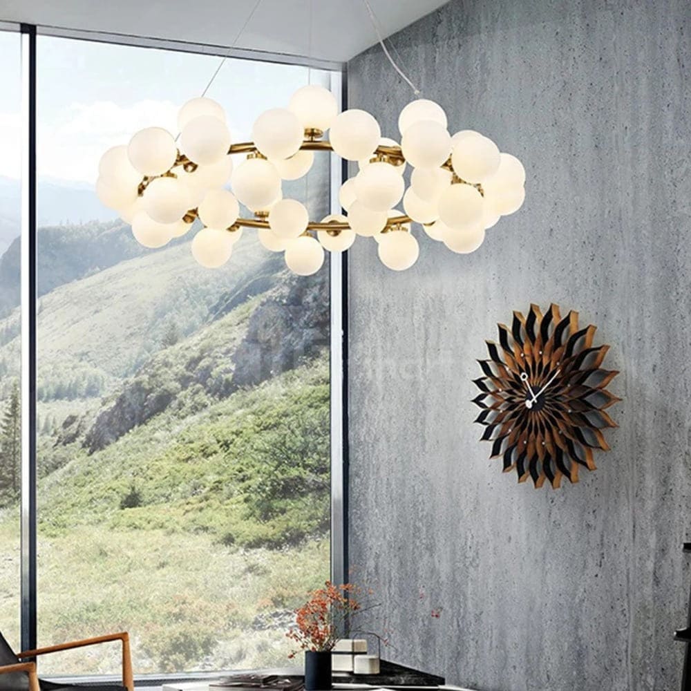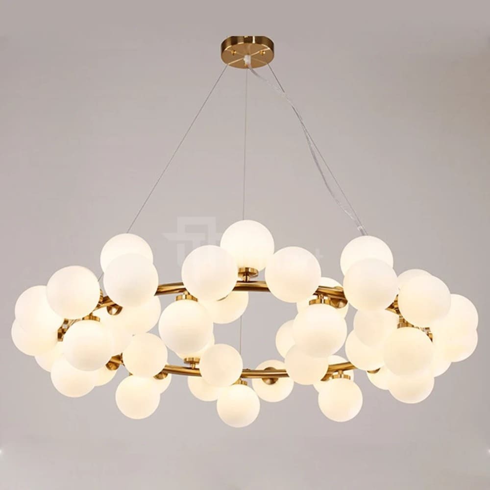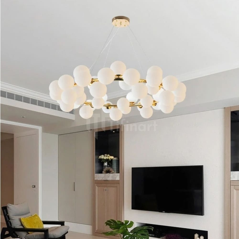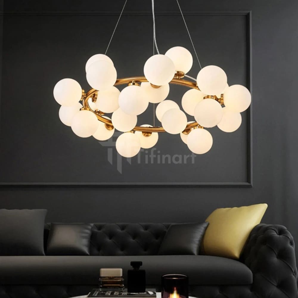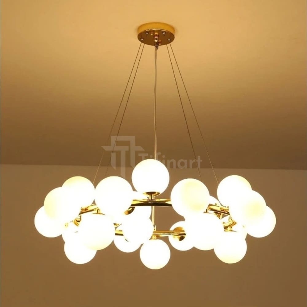 Suspension MAGIC séduit par son design doré moderne et ses élégantes sphères en verre opalin laiteux. Il diffuse une lumière douce et enveloppante, idéale pour créer une ambiance chaleureuse et sophistiquée dans votre salon, votre salle à manger ou votre suite.