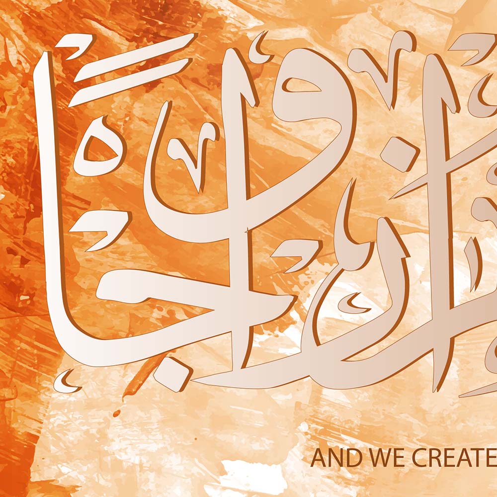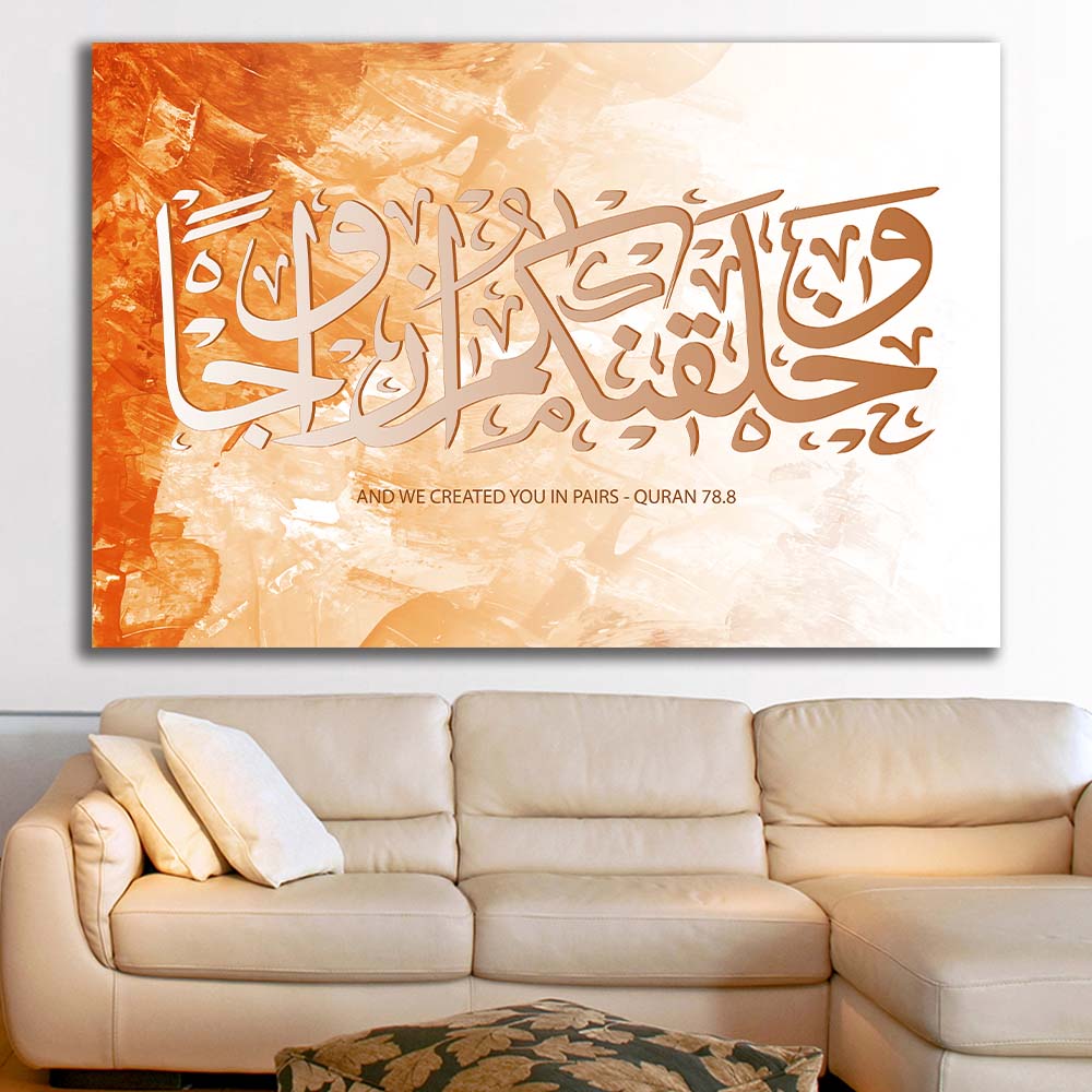 Le tableau ALAZWĀJ présente une calligraphie islamique aux couleurs harmonieuses, élégantes et apaisantes, intégrant le texte sacré "وَخَلَقْنَاكُمْ أَزْوَاجًا" (Sourate An-Nahl, Verset 72). Ce mélange crée une atmosphère spirituelle et captivante, parfaite pour apporter du caractère et un style moderne à n’importe quel espace.