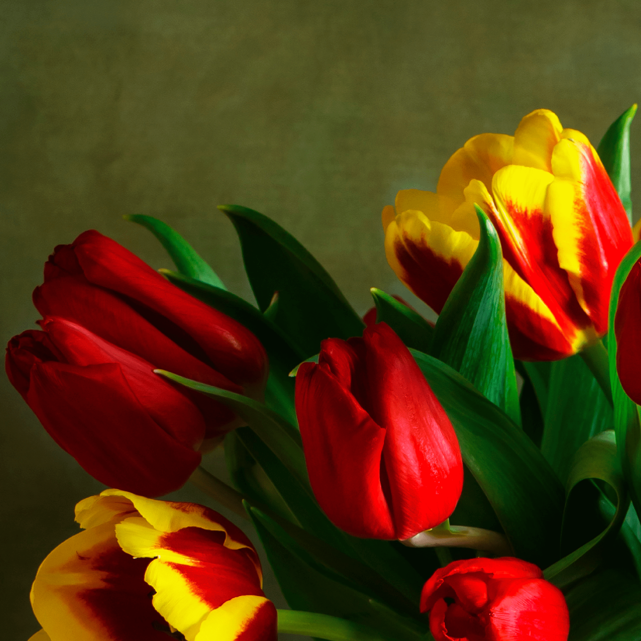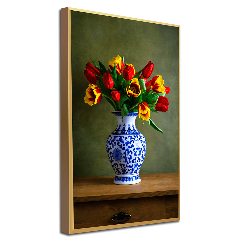 Le tableau AZURE TULIPS présente un bouquet de tulipes installé dans un vase aux tons bleutés, avec une composition raffinée et un style visuel moderne. Les couleurs équilibrées, la fraîcheur florale et la texture artistique créent une ambiance douce, lumineuse et élégante.