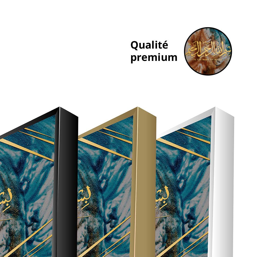 Le tableau BISMILLĀH présente une calligraphie islamique aux couleurs harmonieuses, élégantes et apaisantes, intégrant le texte sacré "بسم الله الرحمن الرحيم" (BISMILLĀH). Ce mélange crée une atmosphère spirituelle et captivante, parfaite pour apporter du caractère et un style moderne à n’importe quel espace.