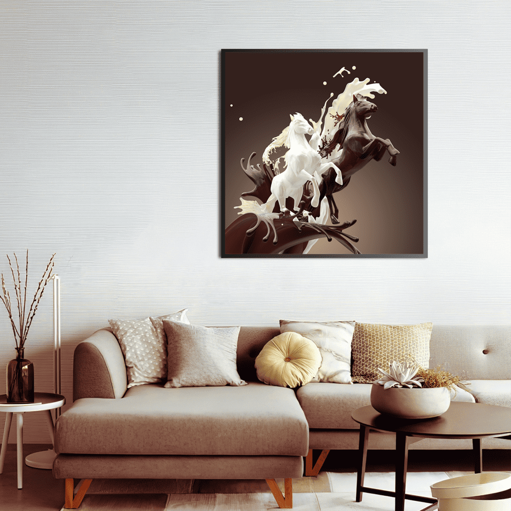 Le tableau CARAMEL RUN représente des chevaux aux teintes lait et café en mouvement, dans un style contemporain et fluide. Les formes dynamiques, les nuances chaudes et le design raffiné créent une ambiance apaisante, artistique et poétique.