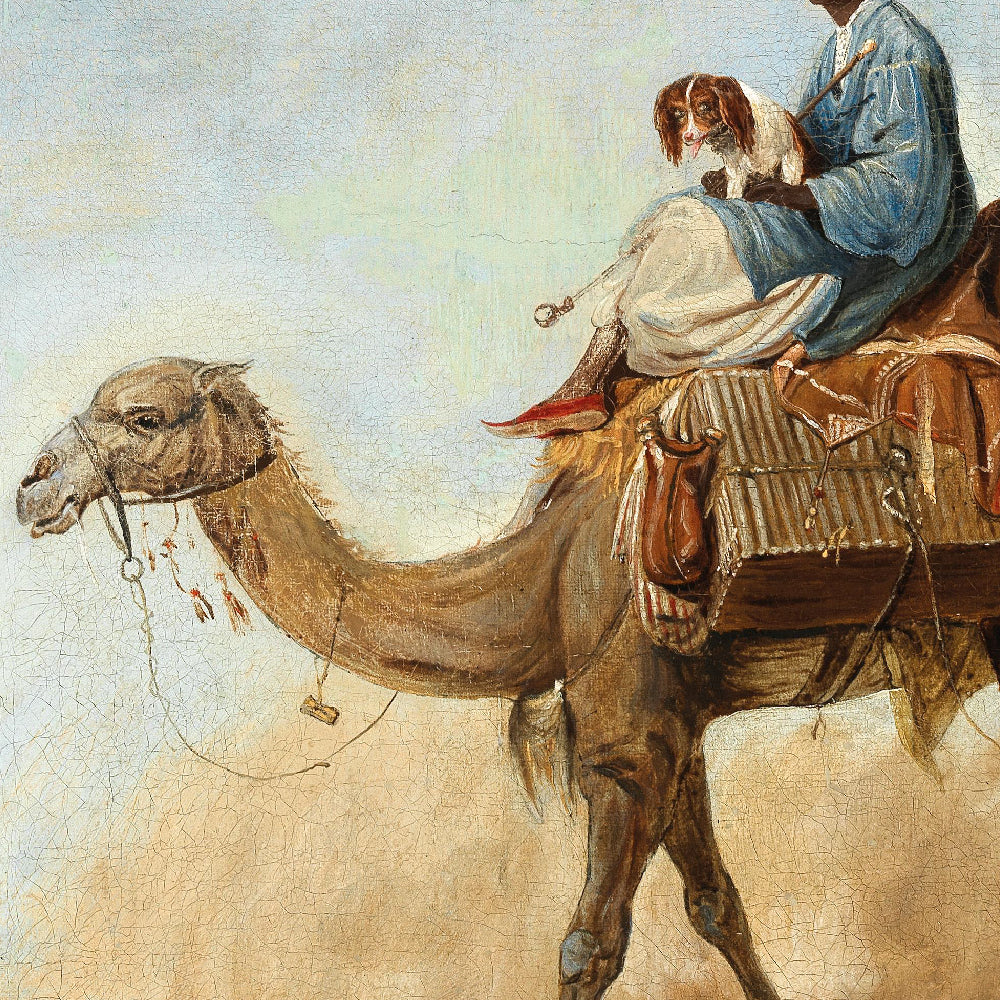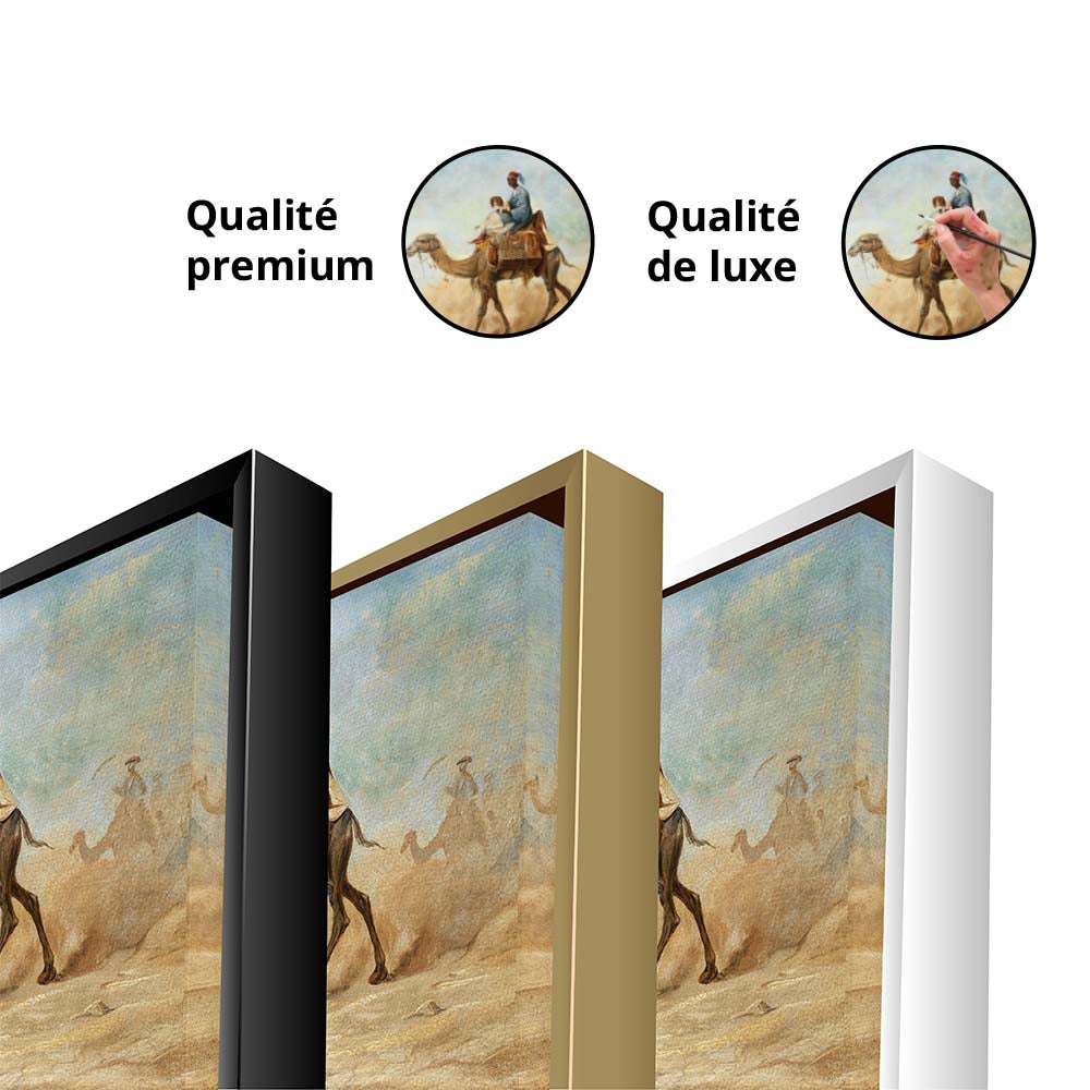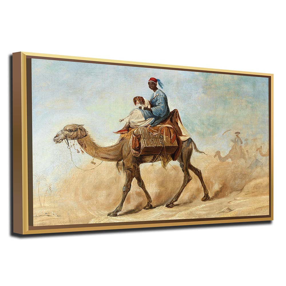 Le tableau COMPAGNONS DU DÉSERT capture un moment unique entre un homme et son chien, installés sur un chameau, au cœur d’une ambiance inspirée par les paysages et traditions marocaines. Les couleurs chaudes, la composition équilibrée et le style vintage créent une atmosphère poétique, authentique et pleine de charme.