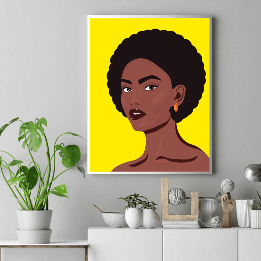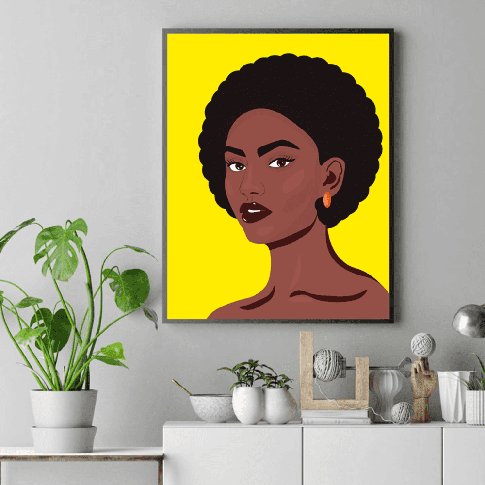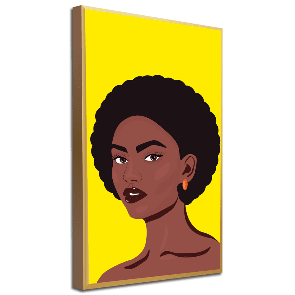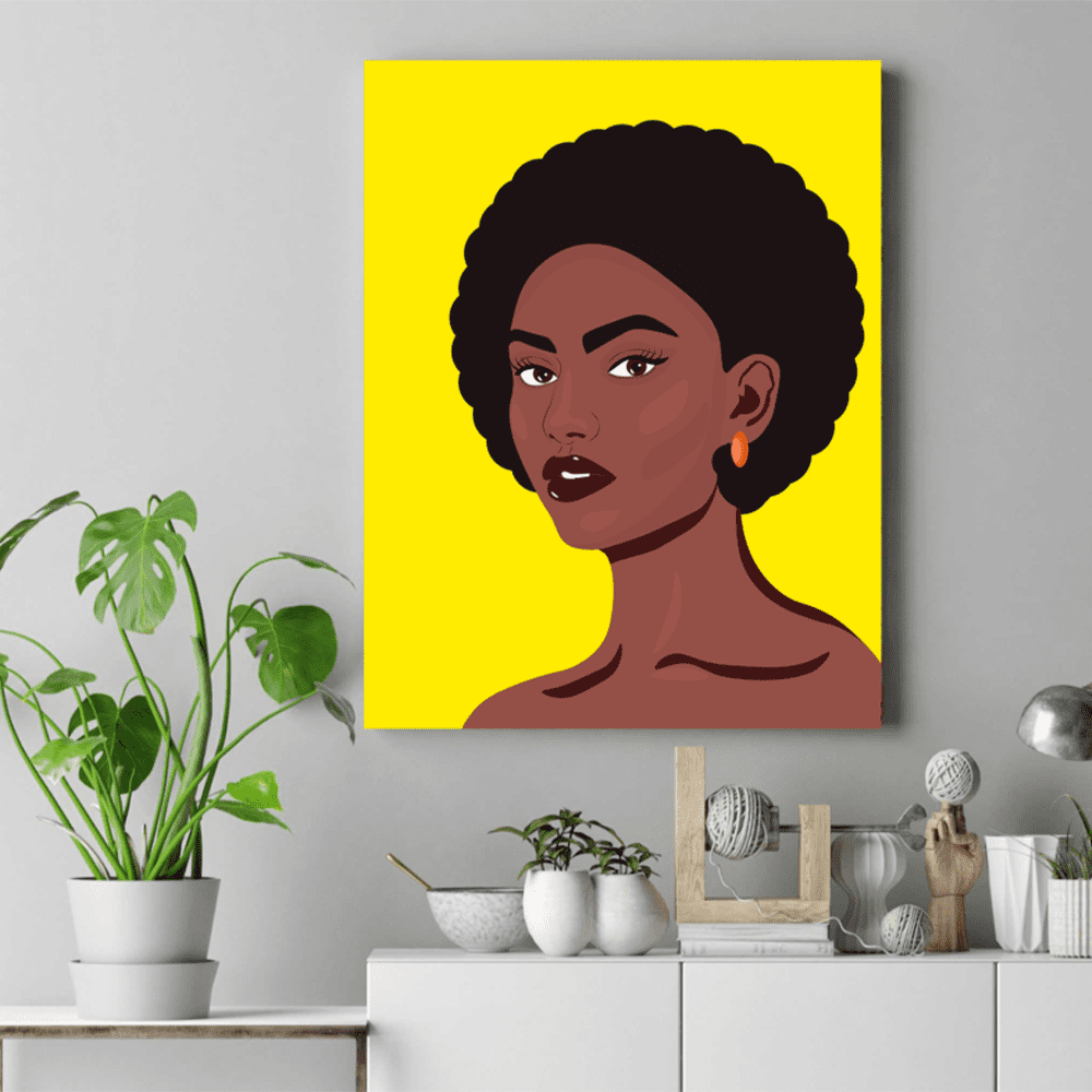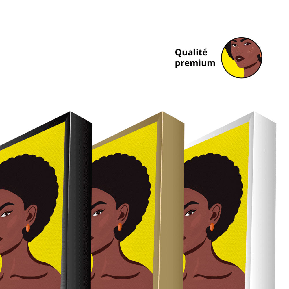 Le tableau ÉCLAT NOIR présente le portrait d’une femme noire élégante, capturée avec un style moderne et expressif. Son regard profond et sa posture gracieuse dégagent force, charme et élégance.