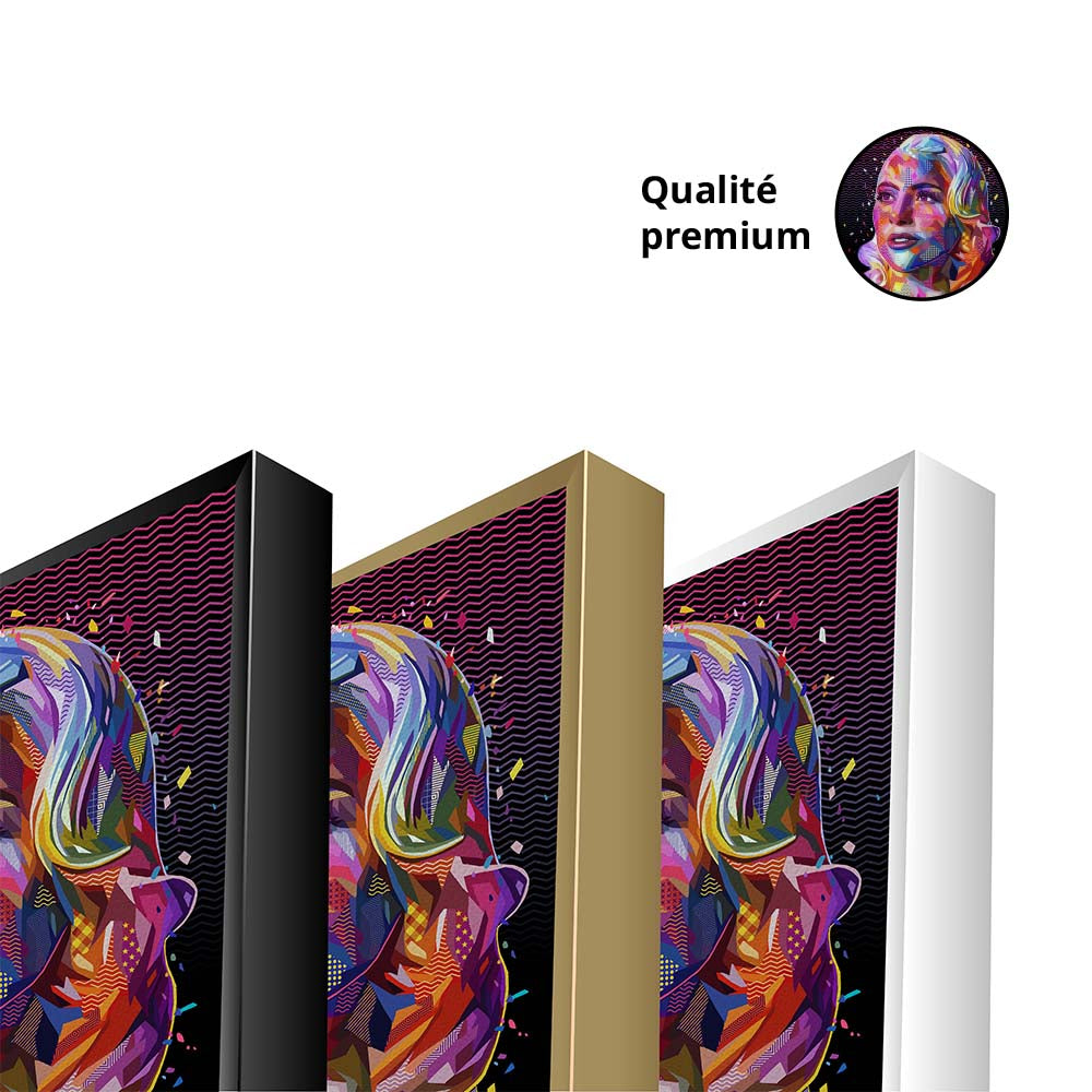 Le tableau GAGA ICON représente Lady Gaga stylisée dans un style pop art contemporain, avec des couleurs vives, des formes graphiques audacieuses et un design moderne et glamour. L’œuvre crée une ambiance excentrique, dynamique et artistique, fidèle à l’esprit de la star.