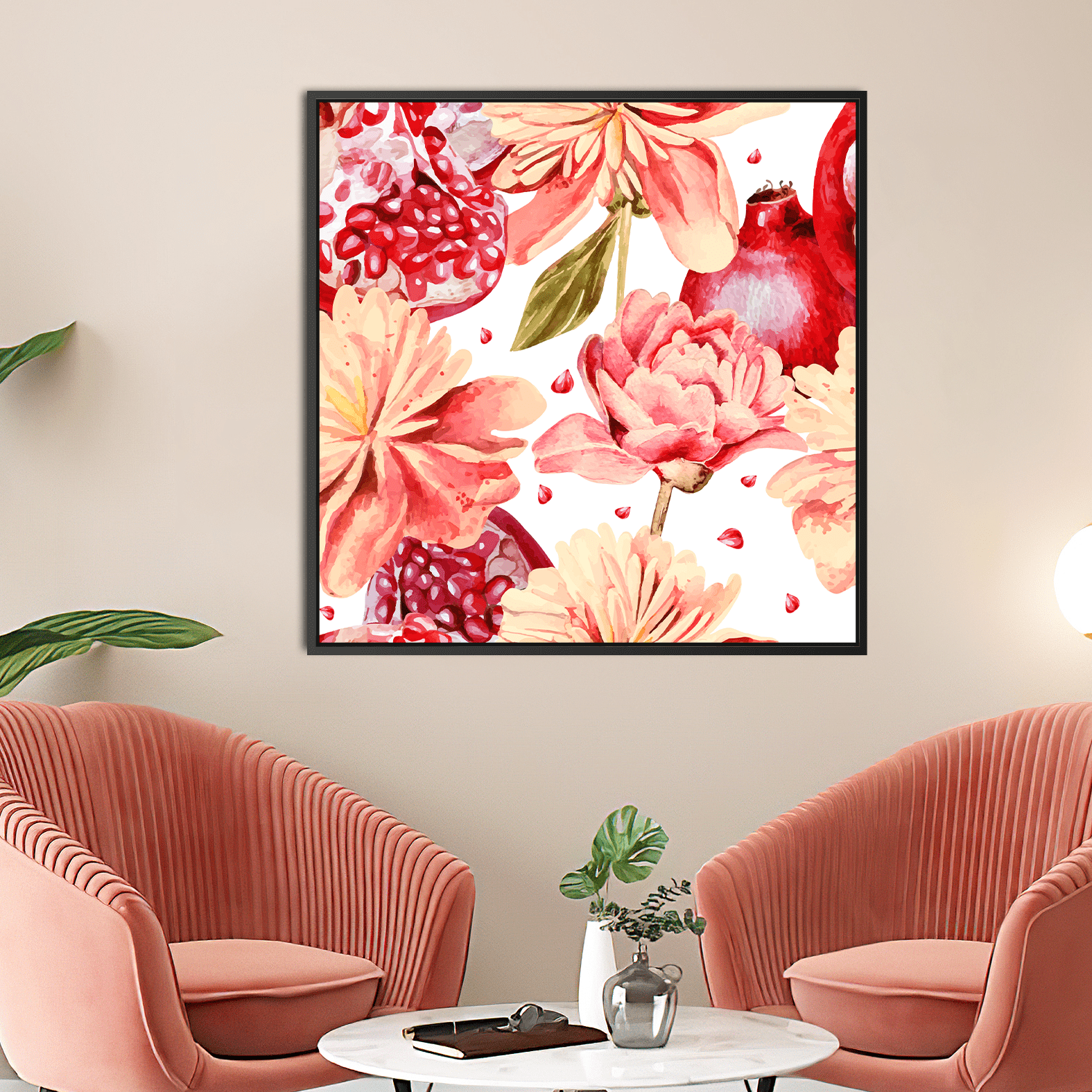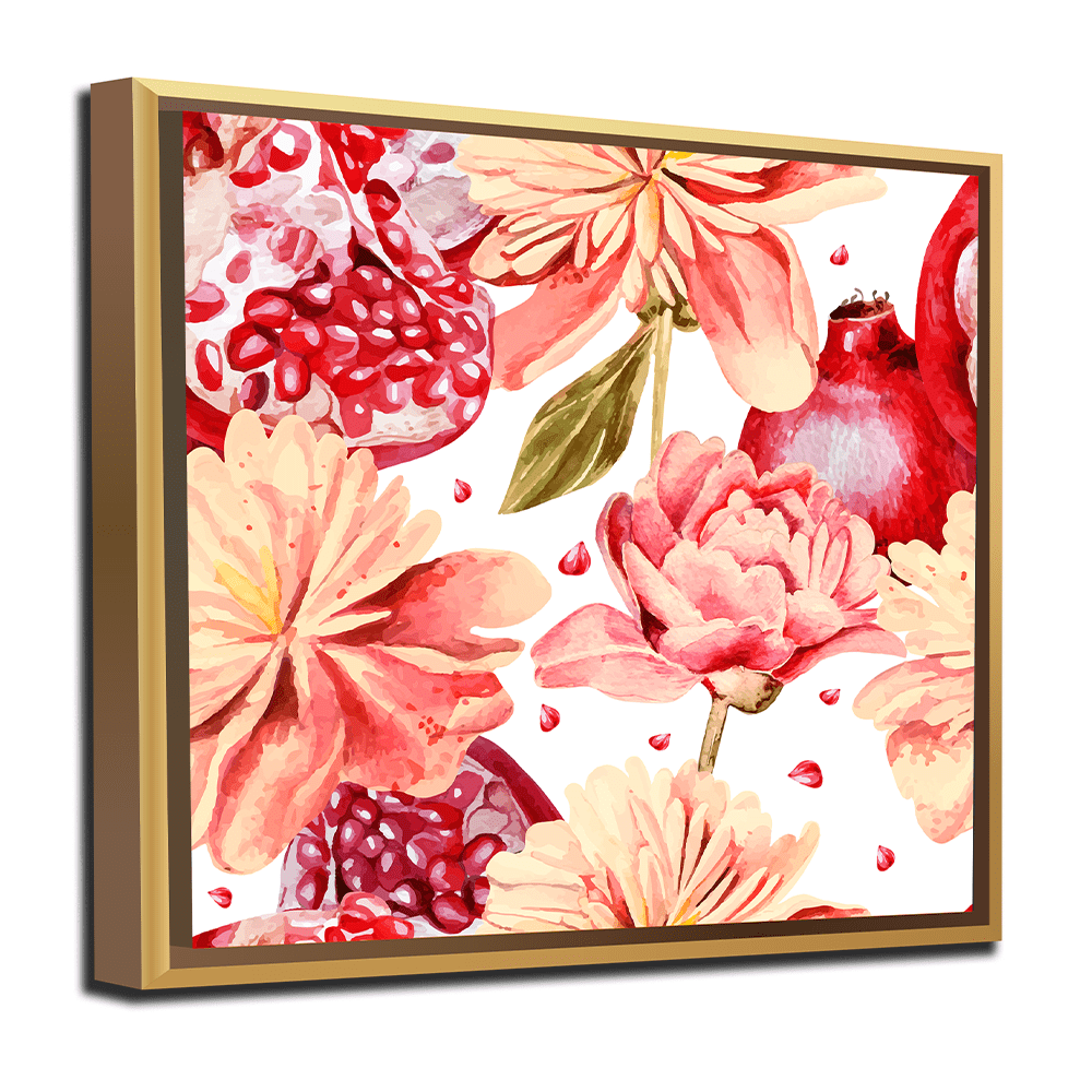 Le tableau POMEGRANEA met en valeur un grenadier en fleurs et fruits peint à l’aquarelle, avec des couleurs riches et lumineuses. Les formes naturelles, la fluidité des pigments et la composition raffinée créent une ambiance élégante, apaisante et artistique.