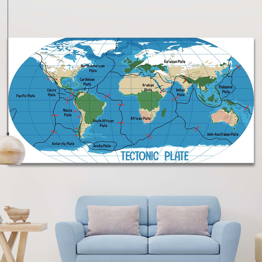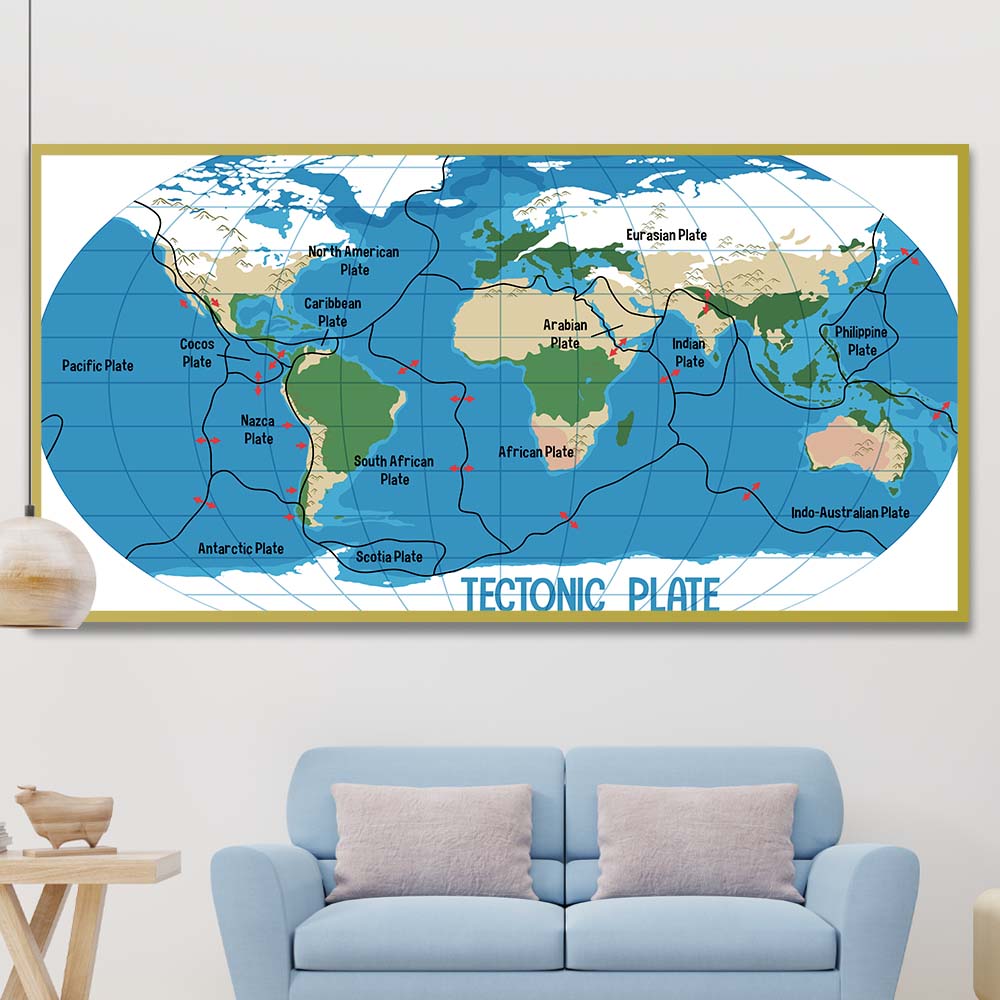Le tableau TECTONIC WORLD présente une carte détaillée des plaques tectoniques dans un style moderne, artistique et éducatif. Les lignes, les couleurs structurées et la composition graphique offrent une vision claire des limites tectoniques à travers le globe, tout en gardant une esthétique décorative.