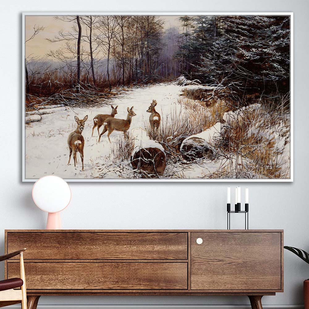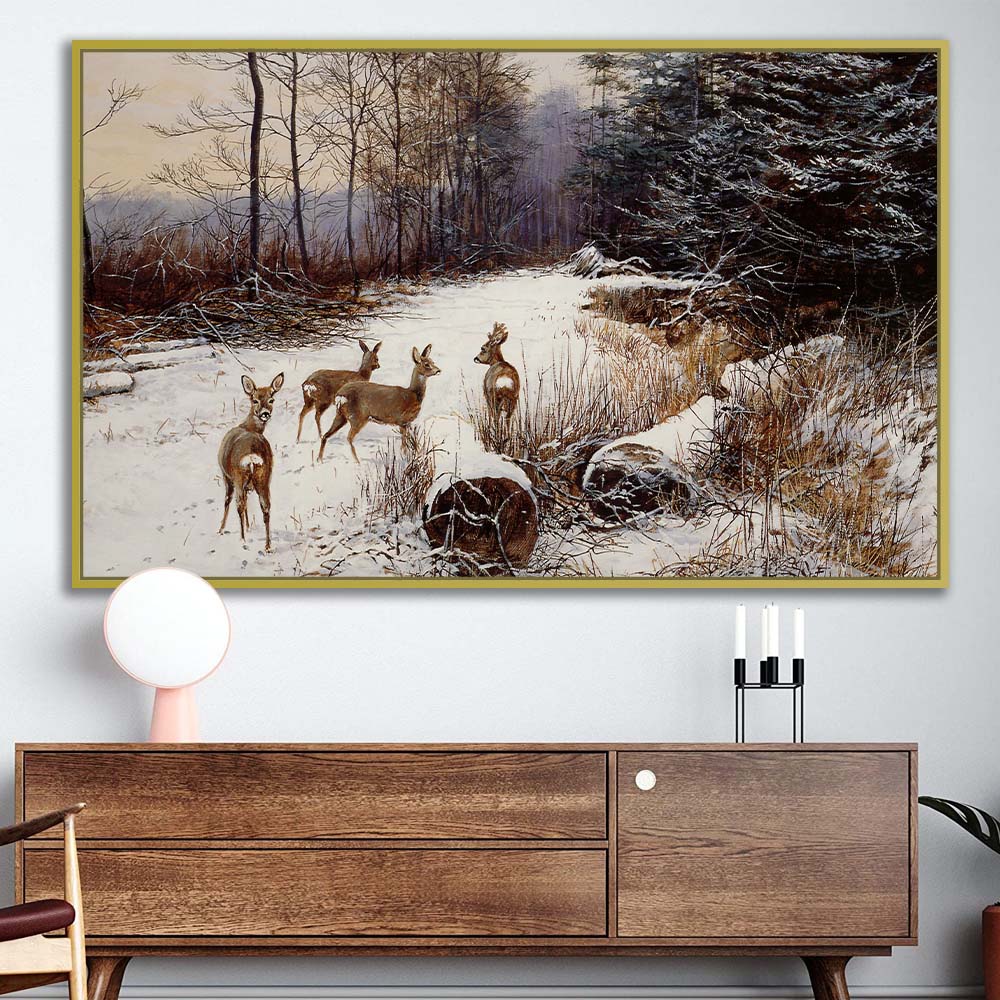 Le tableau WINTER GRACE met en scène des biches dans un paysage enneigé, avec un style scandinave minimaliste et épuré. Les formes douces, les couleurs froides et subtiles et le design contemporain créent une ambiance apaisante, élégante et harmonieuse.